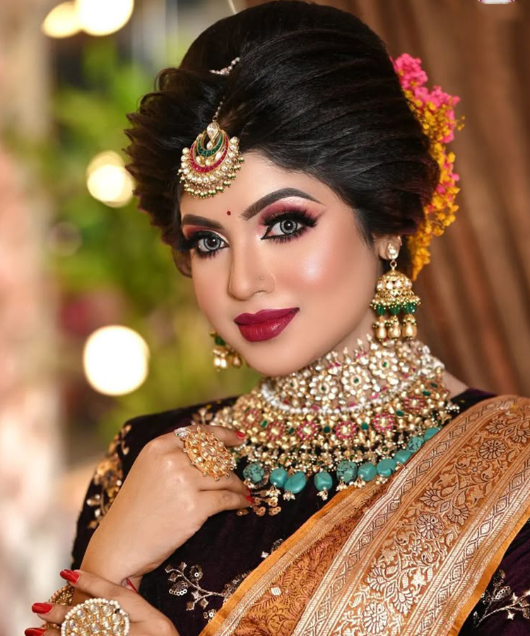 We offer a wide range of professional beauty services including face makeup, eyebrow shaping, hair styling, facial treatments, bridal and wedding makeup, special occasion looks, effect makeup, and complete dressing table setups.
